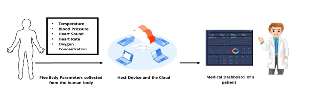 The overview of our IoT-based Health Tracking System is shown. All five body parameters will be collected by the sensors, decoded by the microcontroller units, stored by the host device, and lastly uploaded to the cloud. Doctors can easily access the data by observing the medical dashboard of a patient via our in-house developed Tele-medicine software package www.VirtualDr.com. On the whole, the main priority of our solution is the extraction of vital sign data and making it accessible for doctors remotely.
